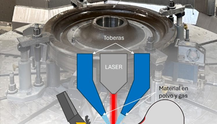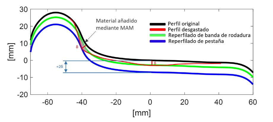 Sin embargo, en los últimos años ha surgido una nueva línea de investigación centrada en explorar métodos alternativos para la restauración de los perfiles desgastados que se enfoca principalmente en la fabricación aditiva metálica (en adelante MAM por sus siglas en inglés, metal additive manufacturing), dado que ofrece versatilidad, precisión y control de energía mayores (Vafadar et al., 2021). De estas, la tecnología de deposición de energía directa por láser (en adelante DED-LB por sus siglas en inglés, direct energy deposition-laser beam) es la más adecuada para la reparación de daños locales. Una clara representación gráfica de esta gran ventaja se muestra la figura 1, en la que se representa un perfil de rueda con un desgaste típico, pero con una profundidad perpendicular a la superficie idéntica en dos zonas, la banda de rodadura y la pestaña. Es posible observar cómo, evidentemente, la reducción diametral necesaria para reperfilar la pestaña es ampliamente mayor que la necesaria para la banda de rodadura. En efecto, puede llegar a ser más del doble. Sin embargo, se muestra también que con la posibilidad de añadir una cantidad pequeña de material, mediante MAM, se lograría evitar eliminar material innecesario y reducir excesivamente el diámetro de la rueda.