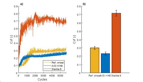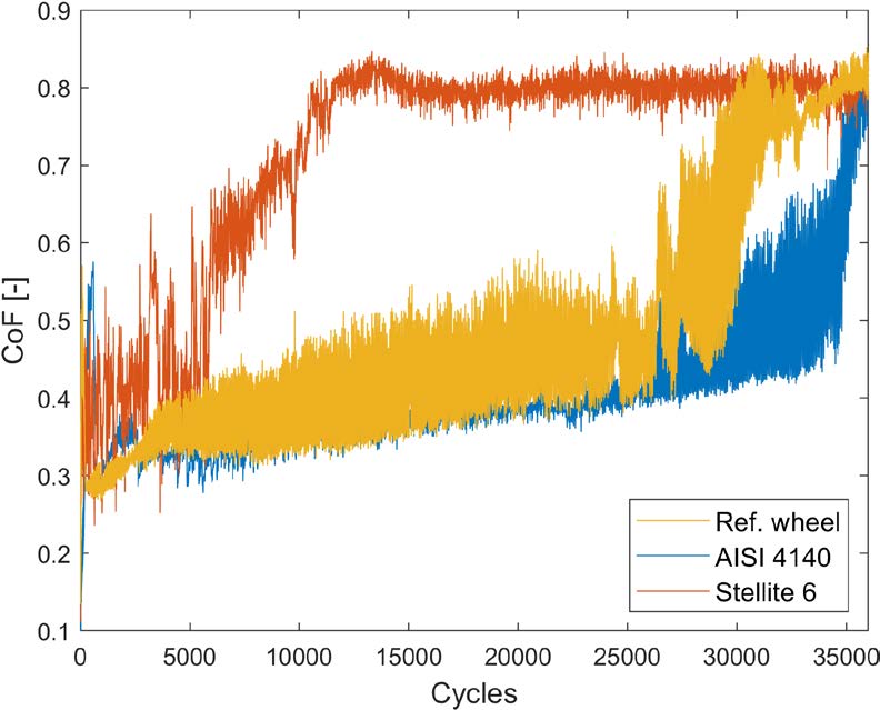 En la primera prueba de desgaste (test 2 en la tabla 4), se llevó a cabo nuevamente la medición del CdF durante todo el ensayo (Fig. 10). Todos los materiales comenzaron con un CdF de 0,1 hasta alcanzar valores significativos, nuevamente alrededor de los 1.000 ciclos. A continuación, el CdF de la rueda sin recubrimiento $uctuó de forma brusca entre 0,35 y 0,5 hasta alcanzar los 28.000 ciclos. Esta falta de uniformidad puede asociarse al desprendimiento de pequeñas partículas superficiales que actúan como una tercera capa intermedia en el contacto. Posteriormente, el CdF aumentó repentinamente a 0,8, lo cual se atribuye a una pérdida de material aún más grave. En el caso del AISI 4140, el comportamiento fue similar durante la primera etapa. No obstante, presenta un comportamiento más moderado durante el incremento desde el CdF de 0,3 a los 1.000 ciclos, hasta el CdF de 0,4 a los 30.000 ciclos. En ese momento, ocurrieron algunas fluctuaciones y la fricción aumentó, al igual que la rueda, hasta 0,8 al final de la prueba. Esto puede indicar que la pérdida de material fue menor y ocurrió en una etapa posterior en comparación con la rueda de referencia. Finalmente, Stellite 6, que ya presentó el CdF más alto anteriormente, comenzó con diversas oscilaciones y aumentó su valor, de nuevo hasta 0,8, antes de los 12.000 ciclos y permaneció estable hasta el final de la prueba. Esto sugiere que la pérdida de material para el Stellite 6 ocurrió extremadamente rápido, lo que aumentaría de forma significativa el desgaste. Este hecho podría verse seriamente afectado por la tensión residual de tracción inicial generada en el recubrimiento de Stellite 6 durante el proceso de LC, lo que acelera, de esta manera, la pérdida de material superficial.