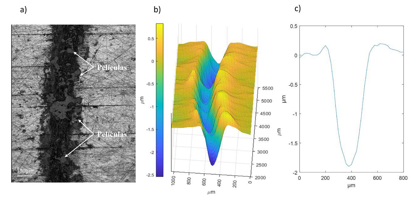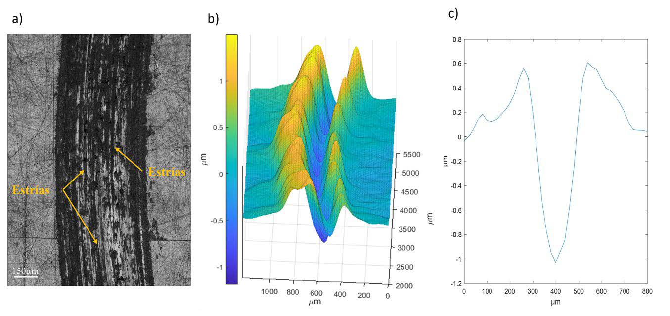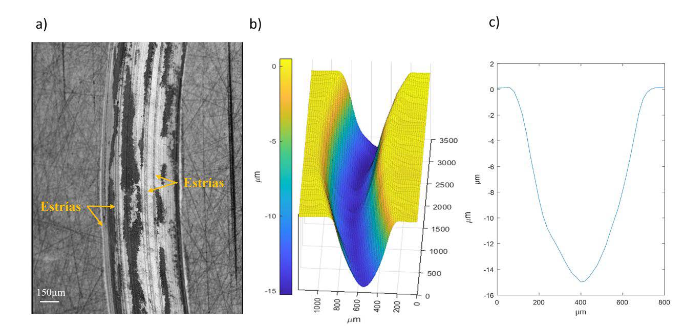 Figura 12. Desgaste de AISI 4140: a) imagen óptica, b) topografía y c) perfil medio transversal.