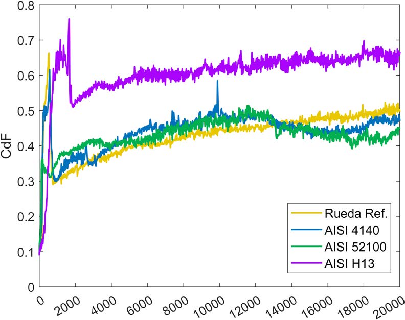 Este tercer ensayo corresponde a una ampliación de la búsqueda del material más adecuado para su uso en el reperfilado de ruedas ferroviarias. Debido al favorable resultado obtenido por el acero AISI 4140 en el anterior test, los nuevos materiales seleccionados fueron otros dos aceros de calidad AISI 52100 y AISI H13, y se analizó de nuevo su comportamiento ante fricción y desgaste. El CdF de este nuevo ensayo se muestra en la figura 14. A primera vista se observa que tanto la rueda como el AISI 4140 y AISI 52100 presentan un comportamiento muy similar, con un valor muy cercano a 0,4, un valor estándar que se espera encontrar en el típico contacto rueda-carril. Sin embargo, pueden distinguirse pequeñas diferencias entre estos tres materiales; mientras que la rueda muestra una tendencia al alza, el comportamiento de AISI 4140 y AISI 52100 puede dividirse en dos etapas: una primera etapa de crecimiento hasta los 1.200 ciclos, en la cual el CdF es ligeramente superior al de la rueda, y una segunda etapa hasta el final del ensayo en la que el CdF de ambos recubrimientos comienza un leve descenso hasta finalizar con un valor menor del de la rueda. Esta diferencia del valor último es aún mayor en el caso del AISI 52100. Además, pico de rodaje (run in peak), el característico máximo inicial de fricción antes de llegar a estabilizarse, es mucho menor en el AISI 52100, Este hecho es otro gran indicio de la excelente respuesta a fricción de este material. Por otro lado, en el caso del AISI H13, este pico es significativamente más alto y duradero, además de tener un CdF también mucho mayor que el resto durante todo el ensayo. Esto sugiere que este material muestra un gran mecanismo de adhesión, lo que es fácilmente traducible a un gran volumen de desgaste.