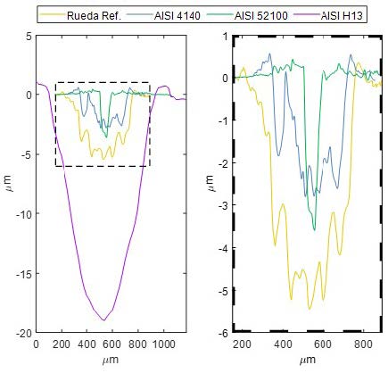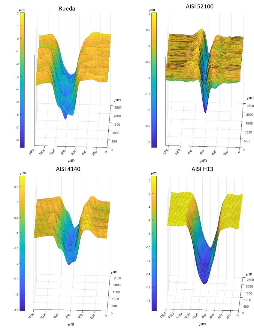 Las topografías y el perfil promedio transversal de los cuatro materiales se muestran, respectivamente, en la figuras 15 y 16. Bajo una primera observación es posible concluir lo anteriormente relatado, pues en el recubrimiento AISI H13 hay una gran cantidad de material eliminado y es visible un trazado de 800 µm de ancho y 20 µm de profundidad. Esta última es, aproximadamente, 4 veces la de la rueda. Por otro lado, el AISI 52100 presenta también un comportamiento irregular, con un perfil no demasiado profundo (3,5 µm), pero muy estrecho (100 µm). Esto puede deberse a una transferencia de material, el cual ha quedado adherido a la bola y actúa como un filo que genera una ranura en el material. Sin embargo, este efecto podría haber sido amplificado por las condiciones cerradas del laboratorio, y es improbable que se reproduzca en un contacto real rueda-carril en el que la posición del contacto es variable y hay grandes fuerzas de arrastre aerodinámicas. Finalmente, el contorno del AISI 4140 es prácticamente similar al de la rueda, lo que indica un mecanismo de desgaste análogo, pero con unas dimensiones, tanto en profundidad (2,5 µm) como en anchura (400 µm), considerablemente menores a las de la rueda, 5 µm y 600 µm, respectivamente. Estos resultados sugieren que el AISI 4140 no solamente puede igualar el comportamiento de la rueda, sino que puede mejorarlo considerablemente, lo cual lo convierte en el material más idóneo para uso en procesos de DED-LB en el reperfilado de ruedas ferroviaria y su requisito de poseer una gran resistencia al desgaste.