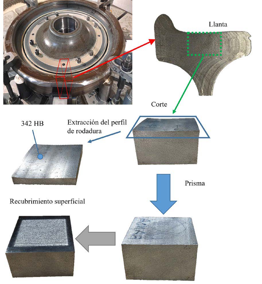 Las muestras fueron extraídas de la banda de rodadura de la rueda. Para ello, la rueda se mecanizó en un centro de mecanizado vertical (VR-2.4, GMTK), de donde se extrajo la llanta y se realizaron diversos cortes en la banda de rodadura. De cada corte se seccionó el perfil de rodadura y se obtuvo un prisma cuadrangular de caras planas con una altura suficiente que garantizara la adecuada evacuación del calor generado durante el proceso de fabricación láser. En la cara superior, a escasos milímetros de la superficie de rodadura, y previamente rectificada, se realizaron los recubrimientos. Este proceso se muestra en la figura 2.