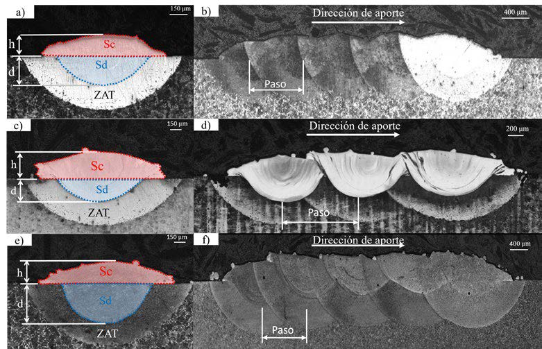 El proceso consistió, en primer lugar, en fabricar cordones individuales y analizar su sección transversal (Figs. 3a, 3c y3e) de forma visual a través de un microscopio óptico (DCM 3D, Leica, Alemania). El objetivo es observar que no haya cambios microestructurales en la zona diluida y la zona afectada térmicamente (ZAT), evitar poros y otros defectos visuales y comprobar que hay una buena integridad entre el material aportado y el sustrato. Esta integridad puede definirse a través del coeficiente de dilución (DC), el cual se calcula en la ecuación 1 a partir de las áreas de la superficie de capa (Sc) y de la superficie diluida (Sd). Sin embargo, a modo de practicidad, este cálculo puede simplificarse a la altura de capa (h) y profundidad (d). Este proceso se repite hasta obtener una altura aproximada de 0,3 mm y un DC superior al 30% que asegura la correcta adhesión de sucesivos cordones (Urresti et al., 2024).