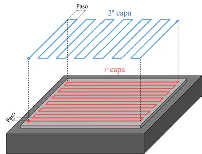 Figura 4. Patrón de recubrimiento (en rojo la primera capa y en azul, la segunda)