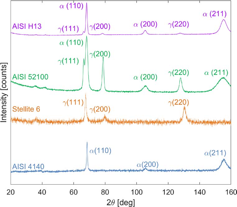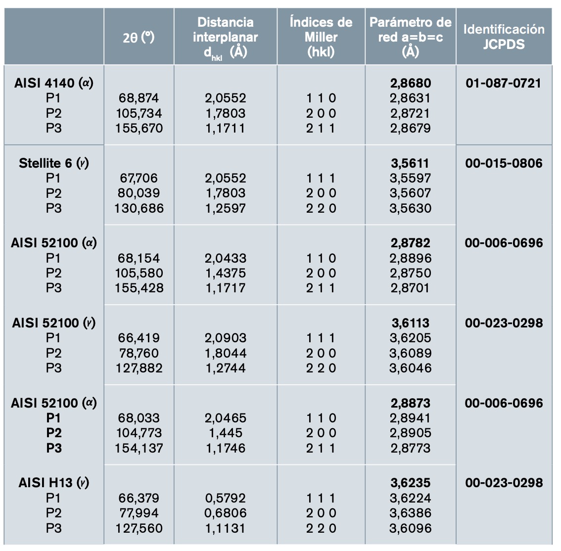 En el caso del Stellite 6, los patrones de austenítica- pura demuestran la existencia de una estructura cúbica centrada en el las caras (FCC), mientras que en los aceros están claramente dominados por la fase ferrita- , estructura cúbica centrada en el cuerpo (BCC). Esta fase es pura en el AISI 4140. Sin embargo, en los casos de AISI 52100 y AISI H13 se refleja también la existencia de fase , lo que indica la presencia de austenita retenida. Este comportamiento es característico de los procesos de fabricación aditiva asistidos por láser, en los cuales la combinación de altas temperaturas —superiores al punto de austenización— y elevadas tasas de enfriamiento impiden que la austenita formada disponga del tiempo suficiente para transformarse en ferrita/martensita (DebRoy et al., 2018). No obstante, es posible apreciar cómo la intensidad de los patrones son mayores para el AISI 52100 que para el AISI H13, lo que indica que esta retención de austenita es mayor para el primero. Esto se debe, principalmente, a la composición química de estos dos materiales (v. tabla 1); AISI 52100 es un material con un alto contenido en carbono (1%), el cual es un es estabilizador de austenita (Saenarjhan, Kang & Kim, 2019); mientras que AISI H13 posee gran contenido de cromo (4,75%) y molibdeno (1,25%), formadores de ferrita (Kuzucu, Aksoy & Korkut, 1998; Ofner et al., 2025). En la tabla 5 se muestra un resumen de los resultados de difracción obtenidos: ángulo 2 , distancia interplanar, índices de Miller, parámetros de red y la identificación correspondiente al estándar JCPDS (Joint Committee on Powder Diffraction Standards).