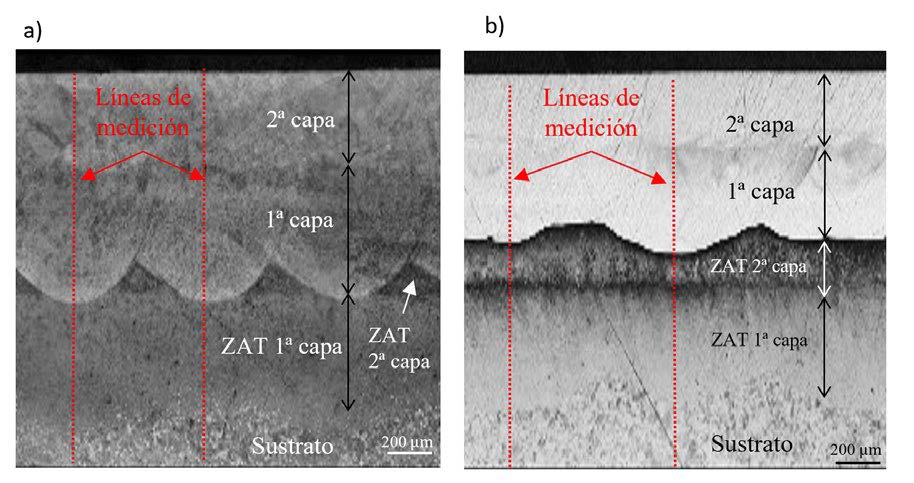 Figura 7. Secciones transversales de los recubrimientos: a) AISI 4140 b) Stellite 6