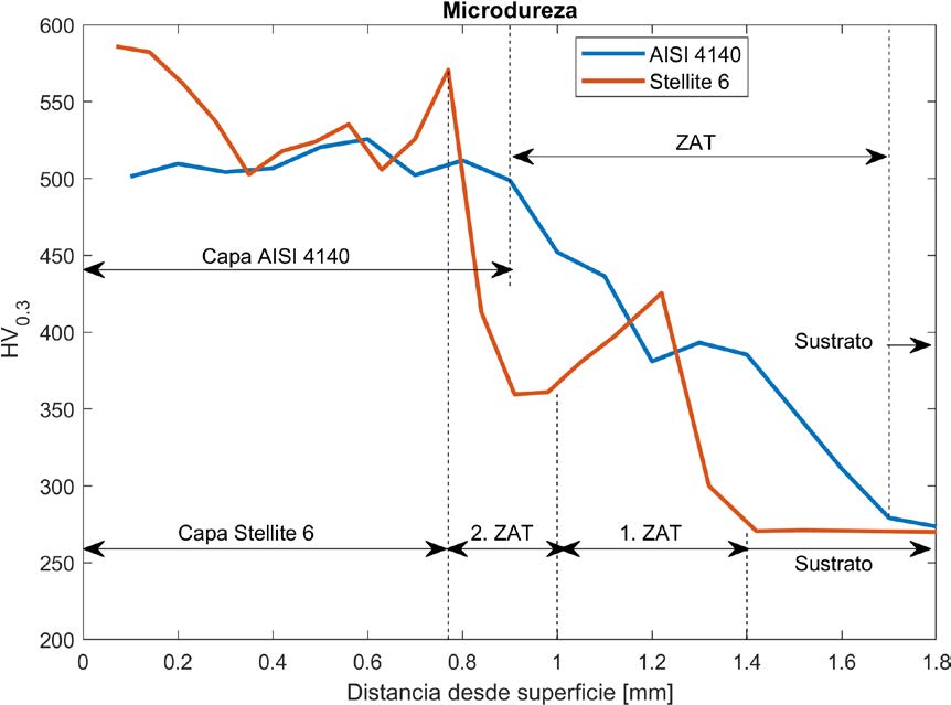 A continuación, se presenta el análisis de microdureza realizado en la primera etapa de la investigación, por lo que únicamente se muestra para AISI 4140 y Stellite 6. Se analizó la transición entre estos revestimientos y sus sustratos mediante metalografías (Fig. 7), y no se observaron fallos ni irregularidades de adhesión, poros ni otros posibles defectos. También se llevaron a cabo mediciones de microdureza siguiendo un procedimiento estándar de 300 gramos de aplicación durante 10 segundos (dwell time). Estas mediciones se realizaron en el centro de los cordones de la primera capa, con dos mediciones por metalografía con dos metalografías por material. El promedio de estas medidas en forma de variación en profundidad se muestra en la figura 8.