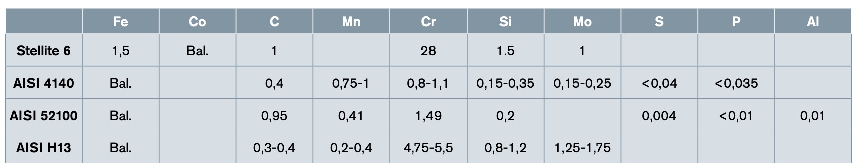 Los materiales de aporte seleccionados fueron Stellite 6, AISI 4140, AISI 52100 y AISI H13. El Stellite 6 es una aleación de cobalto que ha demostrado tener excelentes propiedades frente al desgaste en anteriores estudios (Nellian & Pang, 2023; Nellian et al., 2018; Lewis & Fletcher, 2015; Vasi & Franklin, 2011; Lewis et al., 2016; Roy et al., 2018; Fasihi et al., 2022; Guo et al., 2015; Wang et al., 2014; Wang et al., 2016; Xiao et al., 2023). El AISI 4140 es un acero económico empleado en aplicaciones que requieren poco degaste como engranajes y levas. Además, su composición es muy similar a la de la rueda utilizada aquí como sustrato, por lo que se espera que el revestimiento sea resistente (Tomlinson et al., 2023; Yildirimli et al.,2022). El AISI 52100 es un acero especialmente diseñado para resistir desgaste y RCF, lo que hace que sea muy utilizado en aplicaciones de rodadura, como rodamientos. Finalmente, AISI H13 es un acero asequible y versátil, empleado generalmente para resistir desgaste en aplicaciones de herramientas para trabajos en caliente y en frío. Todos poseen una granulometría -45+105 «m y su composición se muestra en la tabla 1.