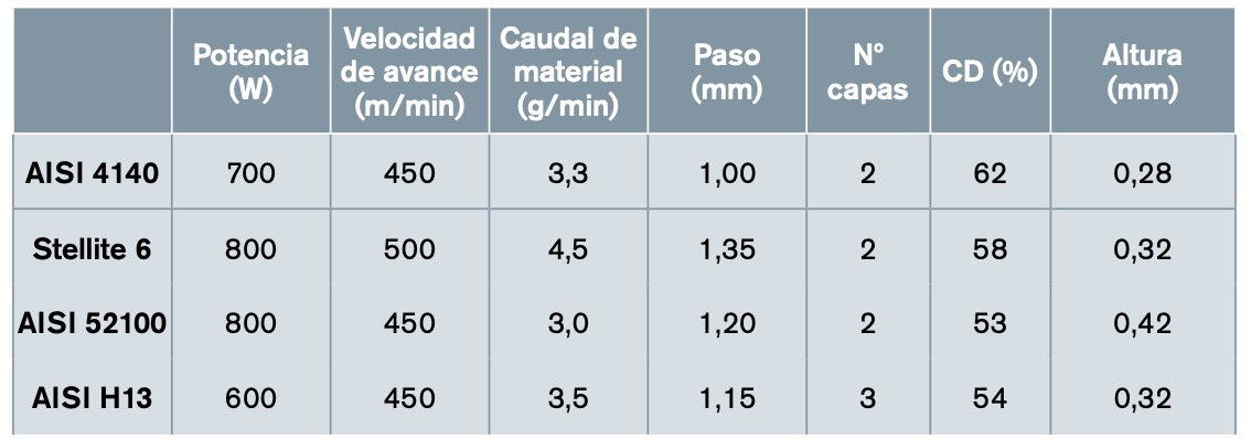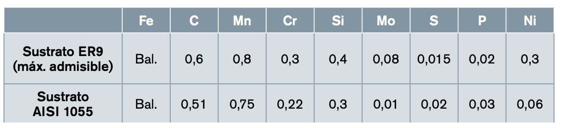 Antes de realizar el recubrimiento sobre la rueda, se llevó a cabo un proceso de optimización, el cual consistió en realizar primeramente cordones individuales utilizando diferentes combinaciones de parámetros, caudal de material de aporte, velocidad de avance y potencia. Sin embargo, por motivos de ahorro de material de rueda y logística (obtención de la rueda, extracción de probetas y preparación), se llevó a cabo antes sobre un sustrato preliminar, AISI 1055, y, posteriormente, sobre la propia rueda. La composición de ambos sustratos es muy similar y se muestra en la tabla 2. Este proceso fue realizado para los aportes de Stellite 6, AISI 4140 y AISI 52100. No fue necesario para AISI H13, ya que se conocían los parámetros óptimos de anteriores estudios.