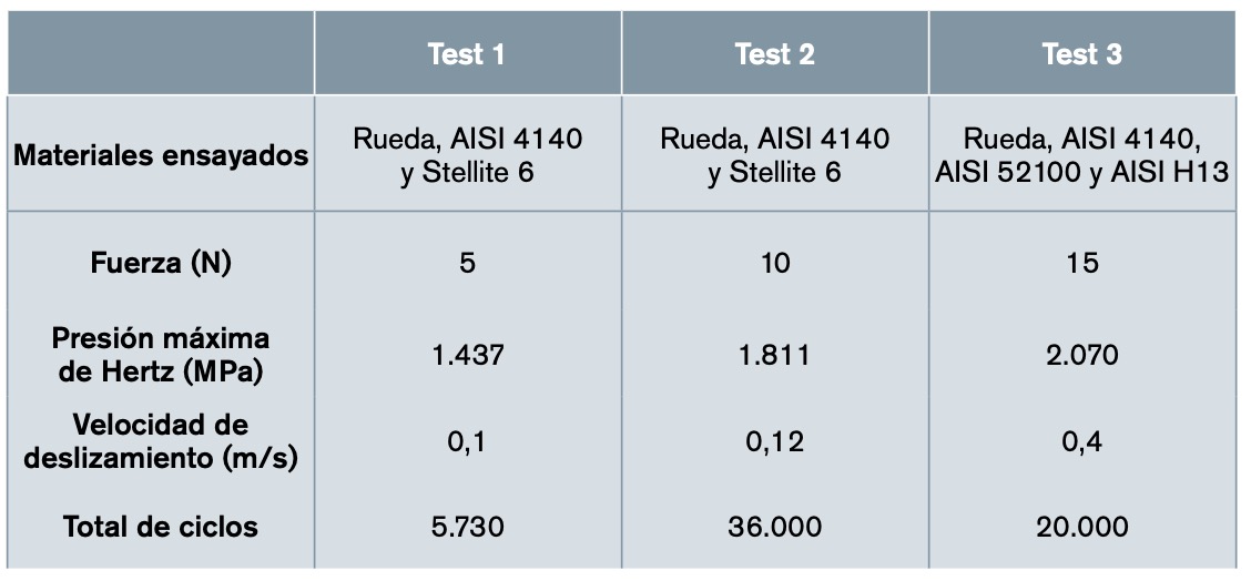 En la primera etapa de investigación se analizaron el AISI 4140 y el Stellite 6, y se compararon con la rueda de referencia mediante un test inicial de fricción y un segundo test de desgaste. Para las pruebas de fricción se empleó una fuerza normal de 5 N, lo que supone una presión máxima de 1.437 MPa, valor típico del contacto rueda con carril, una velocidad de deslizamiento de 0,1 m/s y una duración de 5.500 ciclos. Por el contrario, para analizar el desgaste, se emplearon una fuerza normal de 10 N (1.811 MPa) y una velocidad de deslizamiento de 0,12 m/s, con el fin de acelerar el fenómeno de desgaste. Asimismo, el número de ciclos también se aumentó a 36.000 para lograr estabilización del proceso y obtener una huella de desgaste más significativa. Finalmente, en el tercer test se analizaron los tres aceros, AISI 4140, AISI 52100 y AISI H13, junto con el material de rueda. La carga y la velocidad se ampliaron, 15 N (2.070 MPa) y 0,4 m/s, respectivamente, y el total de ciclos se redujo a 20.000. Un resumen de los parámetros se muestra en la tabla 4. Todos los ensayos se realizaron bajo mismas condiciones atmosféricas, de temperatura, de humedad ambiente y sin lubricación. Todas las probetas fueron pulidas manualmente mediante papel abrasivo hasta obtener una rugosidad Ra < 0,1 ± 0,09 µm.