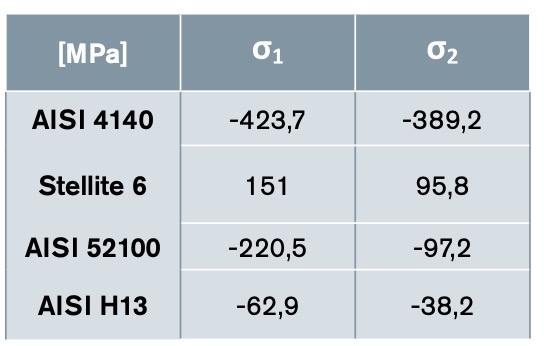 En cuanto a las tensiones generadas durante la fabricación (tabla 6), el Stellite 6 originó un esfuerzo biaxial de tracción, un resultado característico de los procesos de fabricación aditiva DED-LB, debido a los elevados gradientes térmicos que se general durante la fabricación. Sin embargo, en los tres aceros aportados se obtuvieron tensiones de compresión.