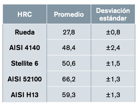 La tabla 8 muestra los resultados de la dureza superficial de cada material, y se muestra un promedio de 10 indentaciones realizadas a cada uno de ellos y la desviación estándar. En el caso de la rueda, se observa un valor de 27,8 ± 0,8 HRC, un resultado inferior al medido sobre la banda de rodadura anteriormente (342 HB, aprox. 37 HRC). Este cambio confirma que, efectivamente, la banda de rodadura se endureció por los numerosos ciclos de carga a los que fue sometida durante su puesta en servicio, mientras que, a escasos milímetros de profundidad, su valor sigue siendo cercano a los 255 HB (aprox. 26 HRC) que dicta la norma. Por otro lado, todos los recubrimientos aumentaron la dureza, y en algunos casos se alcanzó el doble. En primer lugar, se observa que el AISI 4140 posee el menor valor de los recubrimientos, y con una desviación significativa, 48,4 ± 2,4 HRC. Esta desviación es de gran importancia, ya que puede representar indicios de inestabilidad en el material aportado, lo que afecta a su comportamiento. Por el contrario, tanto el Stellite 6 como AISI 52100 y AISI H13 presentan valores más estables, 50,6 ± 1,5 HRC, 66,2 ± 1,3 HRC y 59,3 ± 1,3 HRC, respectivamente. Sin embargo, lo más relevante es que estos valores son superiores al doble del de la rueda, lo que indica una gran mejora en sus propiedades mecánicas y sugiere, por tanto, ser más adecuados para aplicaciones que requieren gran resistencia a deformación y desgaste. No obstante, en el contacto rueda con carril ferroviario una mayor dureza no es necesariamente preferible, ya que podría desencadenar el efecto adverso de aumentar el desgaste del elemento que contactar, el raíl. Comprender y controlar esto es esencial para garantizar una funcionalidad óptima. En este caso, aunque el AISI 4140 tiene el valor más bajo de los materiales revestidos, su elevada desviación podría tener un efecto perjudicial en la estabilidad de la pieza recubierta. Por ello, el Stellite 6 y el AISI H13, con valores promedio no demasiado elevados y baja desviación, pueden considerarse las opciones más adecuadas.